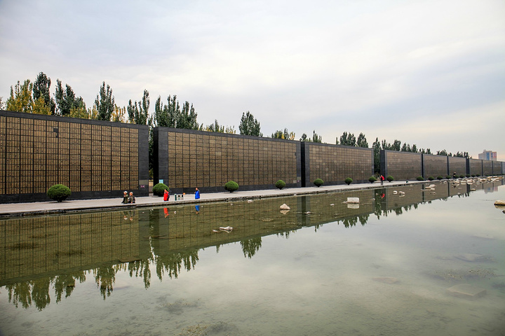 唐山大地震罹难者纪念墙由5组13面墙体组成,镌刻着在1976年唐山大地震中罹难的24万同胞的姓名。纪念墙每面高7.28米,代表7月28日,墙体距水面19.76米,代表1976年,预示着逝者与生者的时间和空间的距离,让人永远铭记1976年7月28日这个令唐山人悲恸的日子。