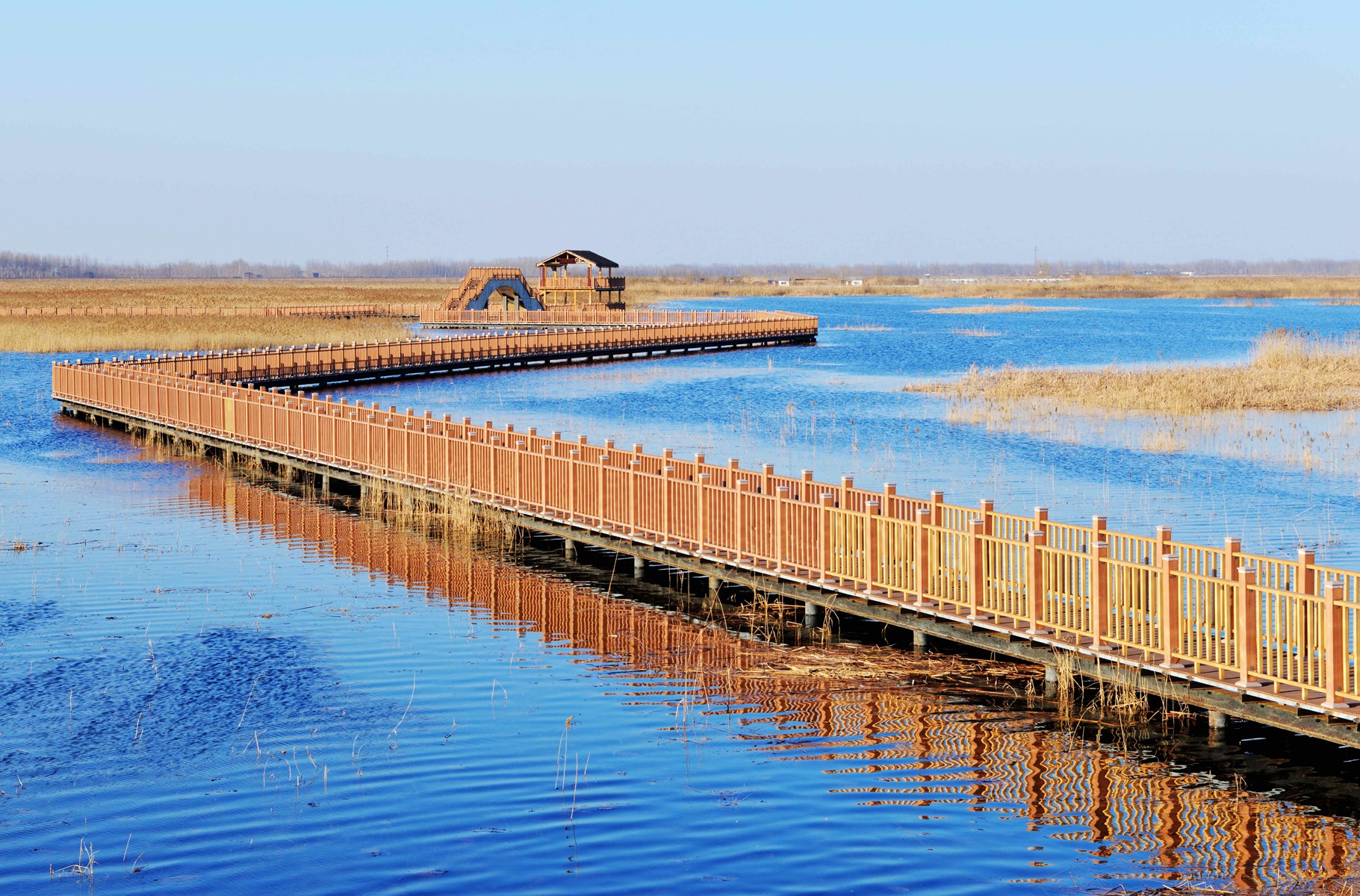 “问源亭”处在白洋淀栈道的入口处,建于2015年,亭上采用悬有清朝乾隆帝御笔,亭柱楹联是安新籍清代状元陈德华题。此亭,单层单檐大圆顶,由三层立柱支撑,每层16根,再加上中心点最高最大一根 共49根,直径12.5丈,周长39丈,形体巨大,从柱的根数,长短尺寸到四周的栏杆数多少皆是至尊的文化数字。